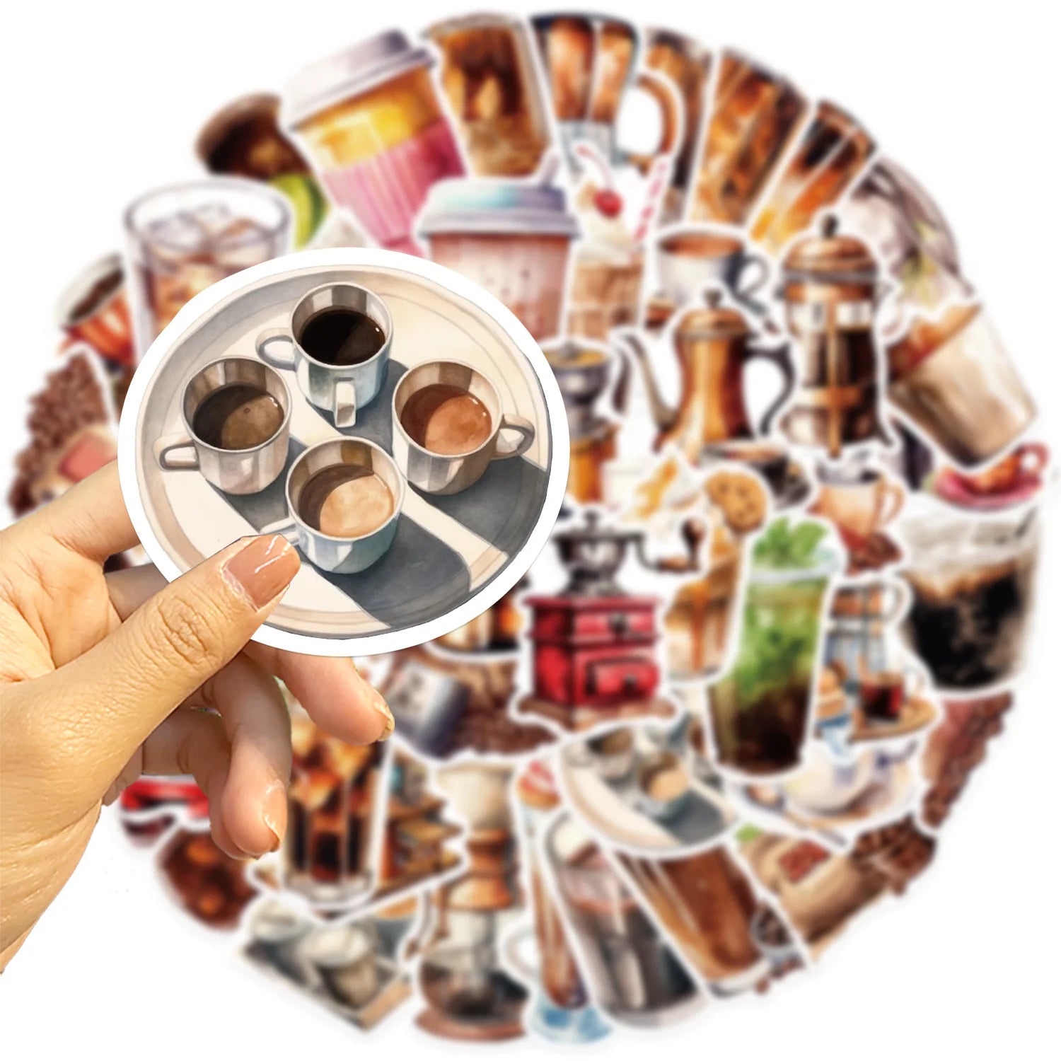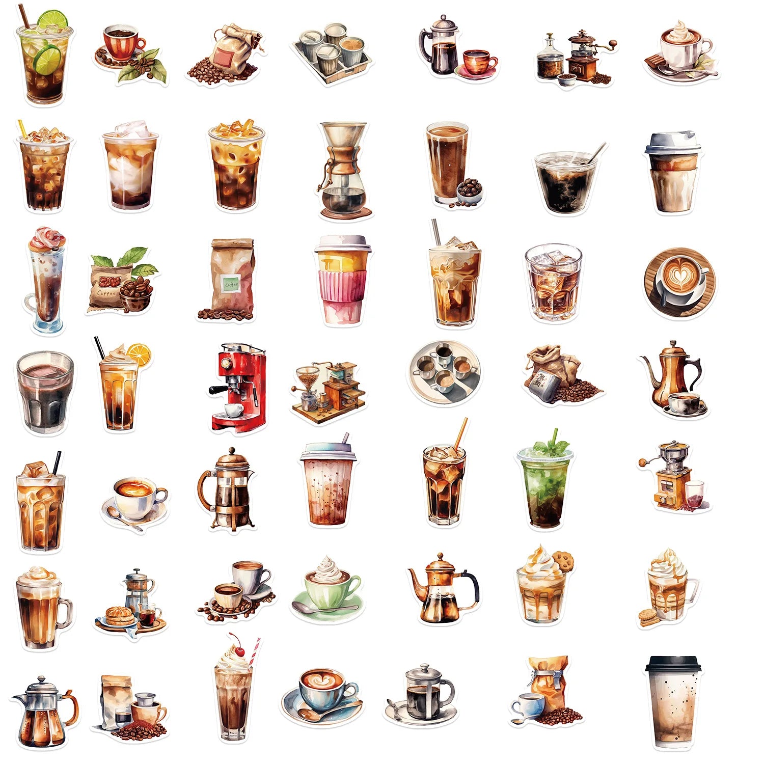 Förvandla varje pryl till ett litet café! Det här 50-packet rymmer allt en kaffeälskare drömmer om: espressomaskiner, presskannor, moka pots, pour-over, cappuccino med latte art, iskalla frappes, kvarnar, bönor och söta koppar. Klistra på laptop, termos, vattenflaska, journal eller kaffevagnen på jobbet och sprid barista-vibes överallt.