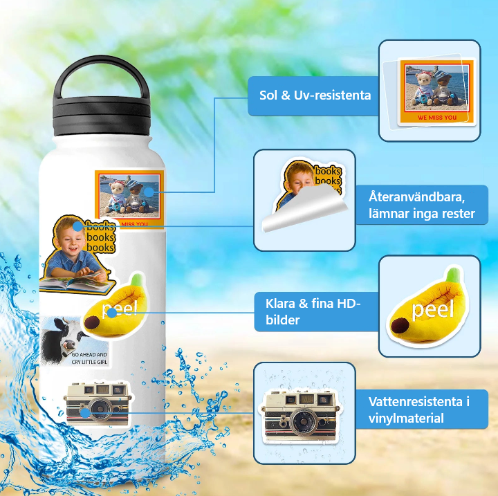 ✨ Klistermärken: Vattenresistent vinyl som fäster snyggt och släpper taget utan klisterrester – laptop-, mobil- och flaskvänliga. 💧🧽