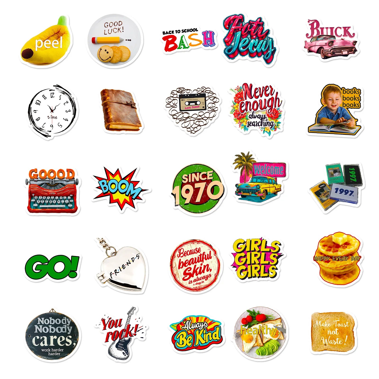 🎉 50-pack Retro Pop & Good Vibes – Vattentåliga Quote-Stickers i Vinyl