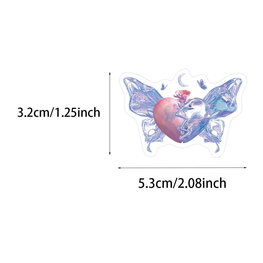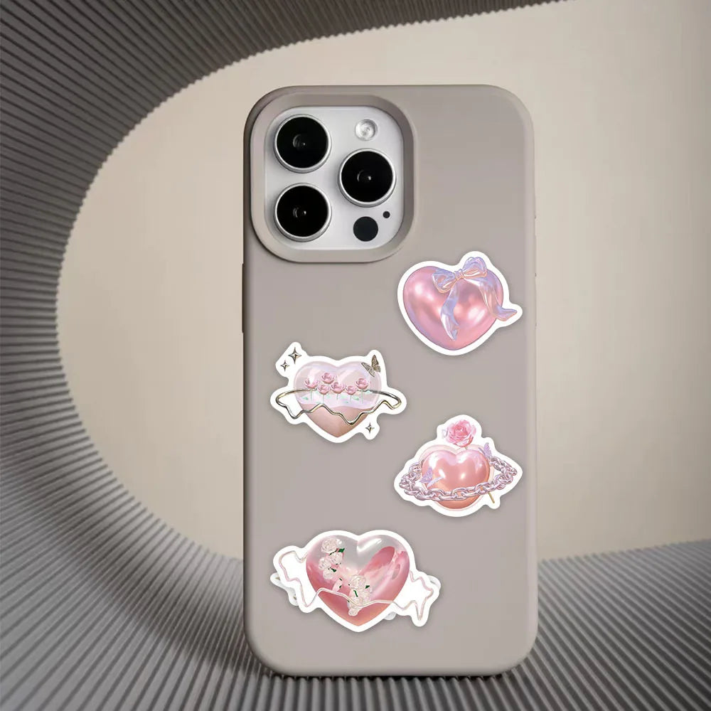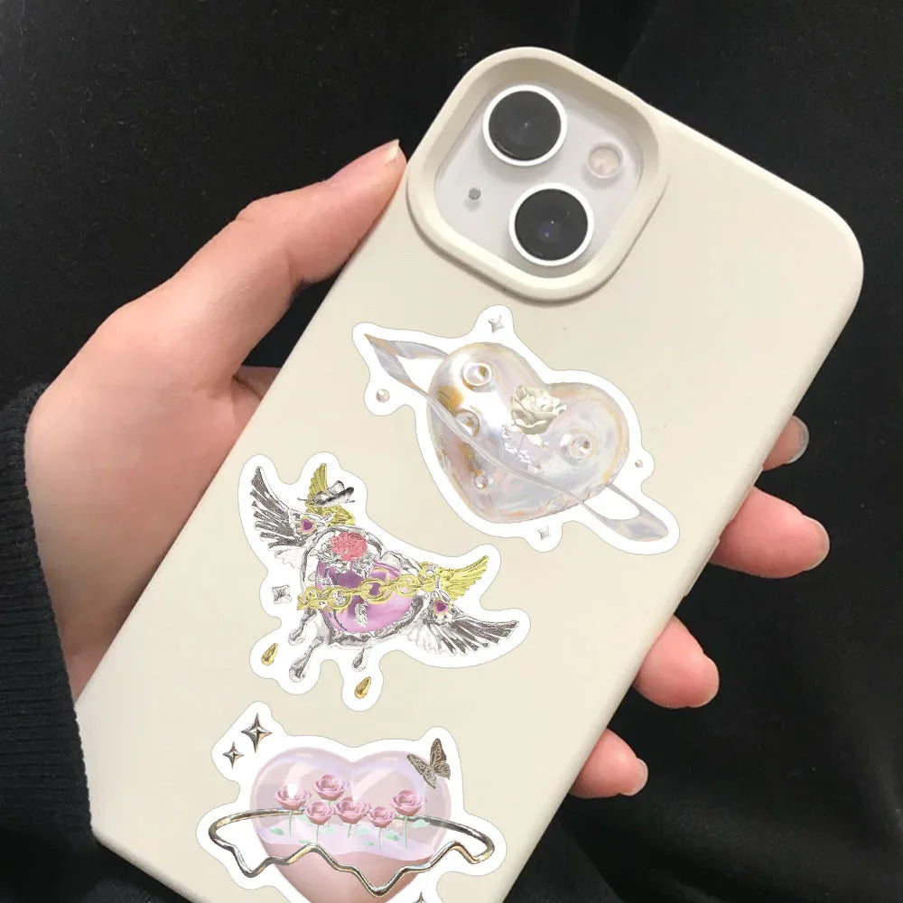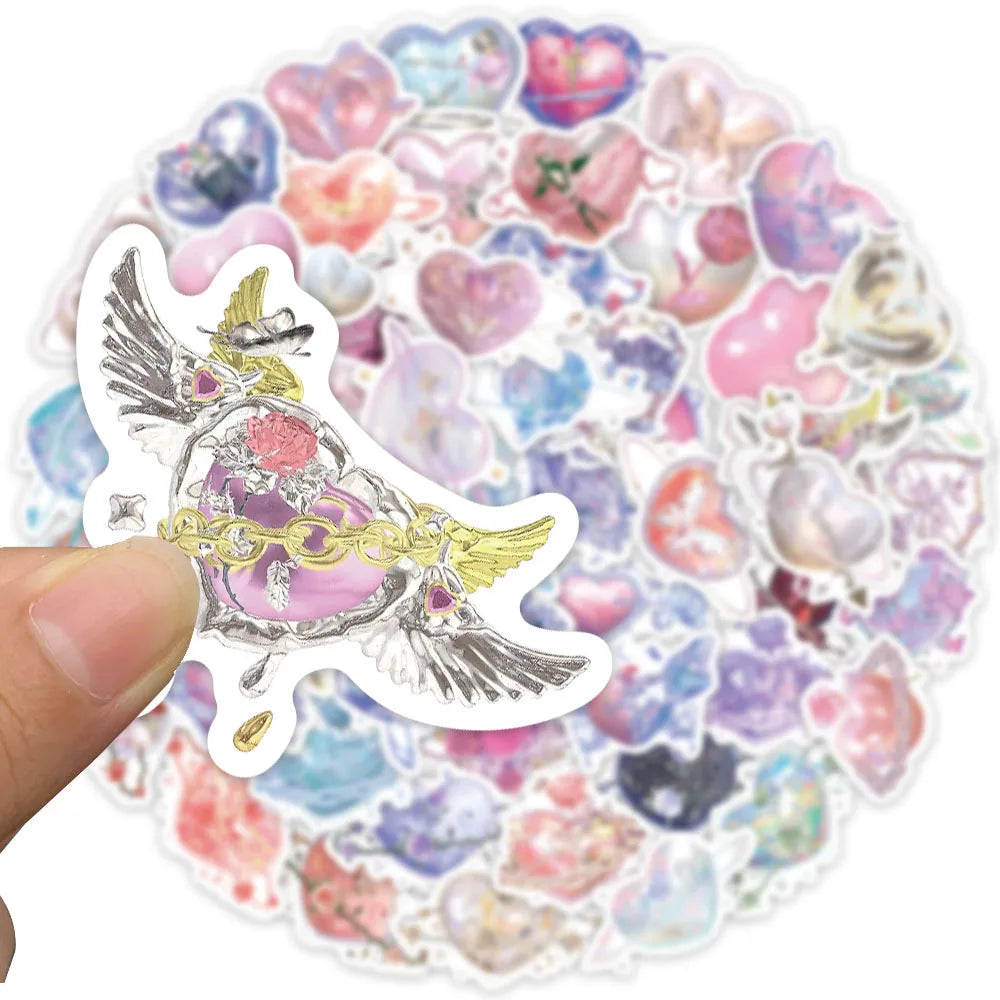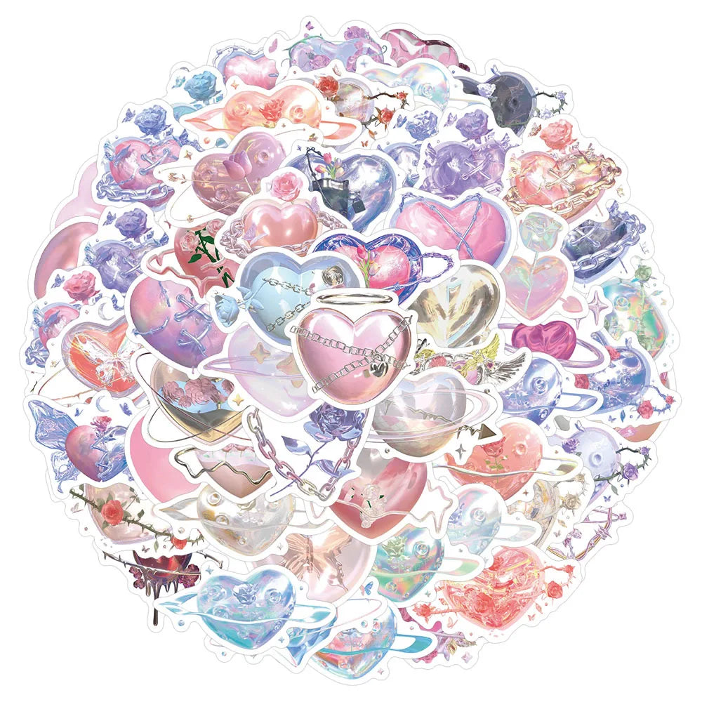 Ge prylarna kärleks-glans! Detta 60-pack samlar iriserande hjärtan i rosa, lila och blå med kedjor, vingar, rosor och små stjärnor – som små smycken du kan klistra. Perfekt för laptop, mobilskal, vattenflaskor, dagbok och scrapbooking.
