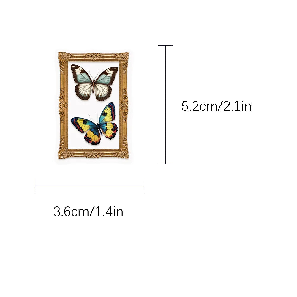 Gör dina prylar till ett litet museum! Det här 52-packet samlar eleganta fjärilar i små vintage- och guldramar – perfekt för dig som älskar natur, nostalgi och stil. Klistra på laptop, mobilskal, vattenflaska, resväska eller bullet journal och bygg ditt eget mini-galleri, bit för bit.